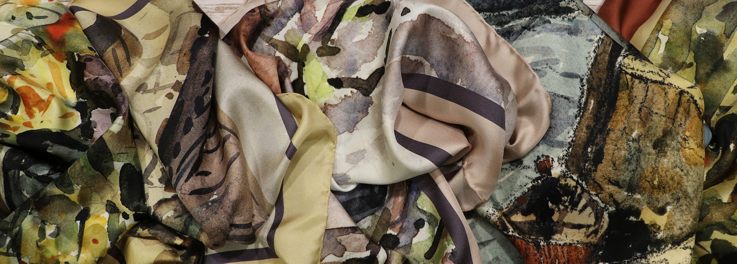 And here the magic begins as these beautiful watercolour paintings are reproduced on sumptuous quality silk to make fabulous scarves. For this season, we've introduced a smaller version of our popular 900x900mm. Each scarf has a delightful, handrolled hem giving that stability and drape just perfect for completing your 'look'.