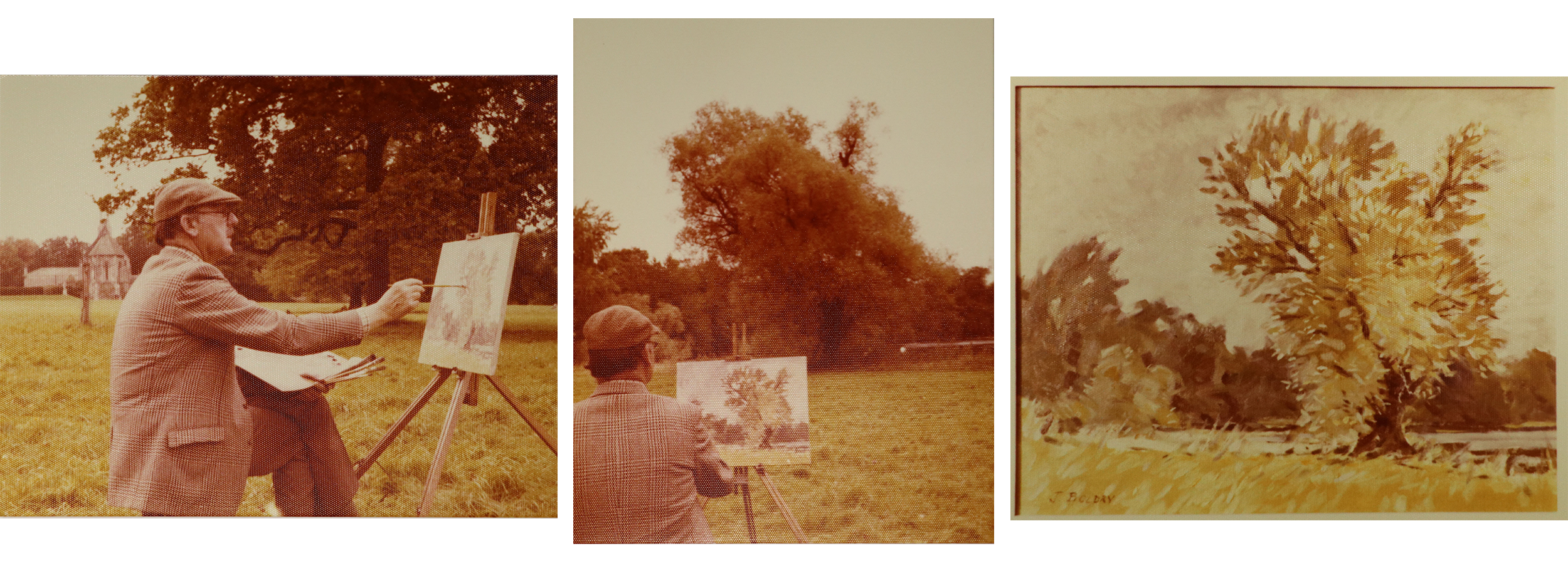 Here we see him at work at Sandbeck Park Estate in Yorkshire with the subject in the background, along with a photograph of the final artwork. The photographs were likely taken by Joan.